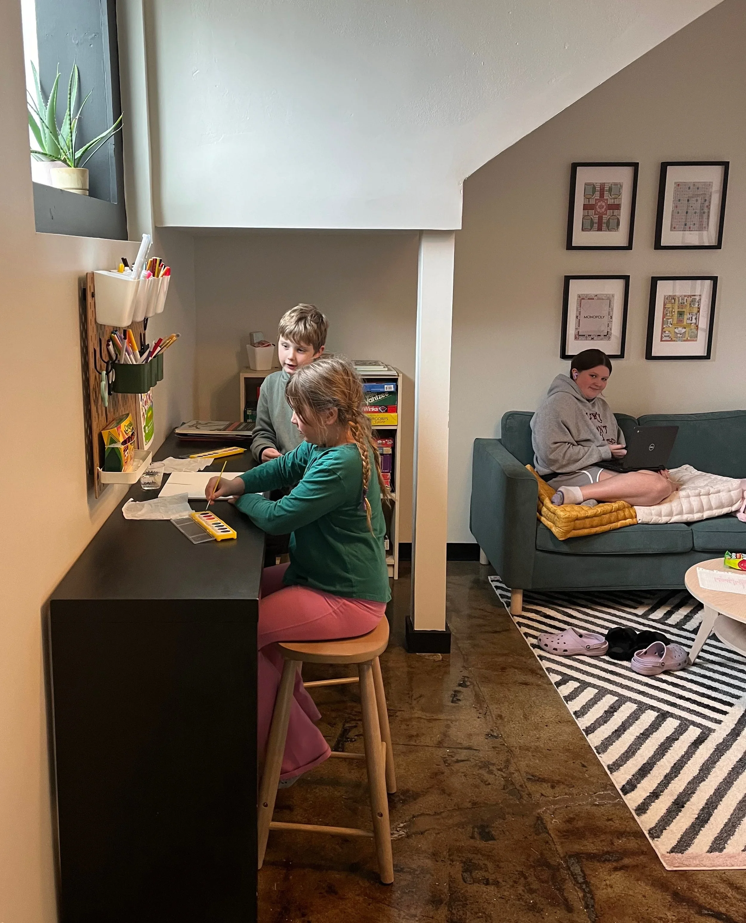 We have created a welcoming space designed specifically for big kids to study, work, and play while their parents are busy. This innovative environment offers a blend of quiet study area and engaging play space to spark creativity and fun. Whether diving into homework or enjoying some recreational activities, this space is tailored to meet the needs of growing minds, making it a perfect haven for big kids.